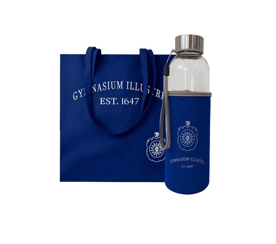 Medžiaginio maišelio su šilkografine spauda ir grūdinto stiklo buteliuko su minkšto audinio dėklu rinkinys, skirtas šviesiosios gimnazijos bendruomenei.